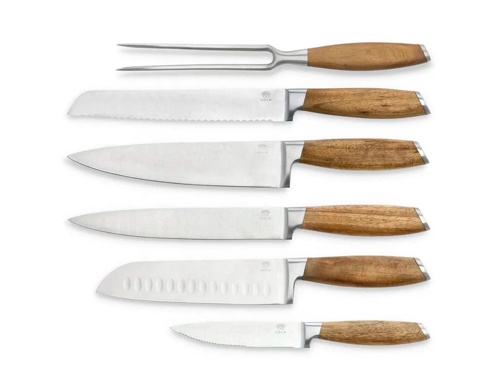 Knivsættet indeholder fem lækre knive universalkniv 24 cm, santokukniv 31 cm, filetkniv 33 cm, kokkekniv 33 cm, brødkniv 33 cm og en stegegaffel 29 cm. De flot rundede skafter, der ligger behageligt i hånden, er af akacietræ med virkeligt smukke og kara