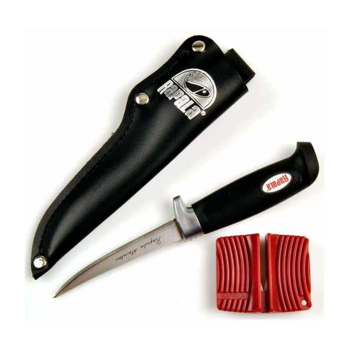 Lækker filetkniv fra Finske Rapala. Fremstillet i kvalitets rustfri stål, med fleksibel knivs spids og blødt nubret gummi håndtag, der sikrer godt greb, selv under våde forhold. Leveres med skede og kniv sliber.